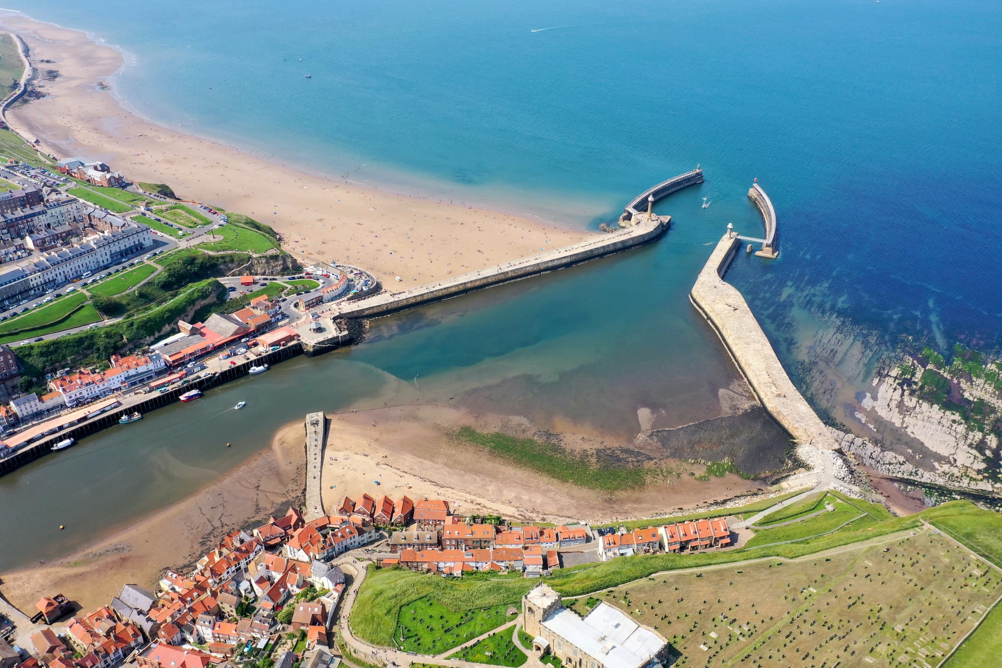 Whitby Beach, located in the historic town of Whitby on the North Yorkshire coast, offers a beautiful expanse of sandy shores backed by dramatic cliffs and picturesque views of the North Sea.